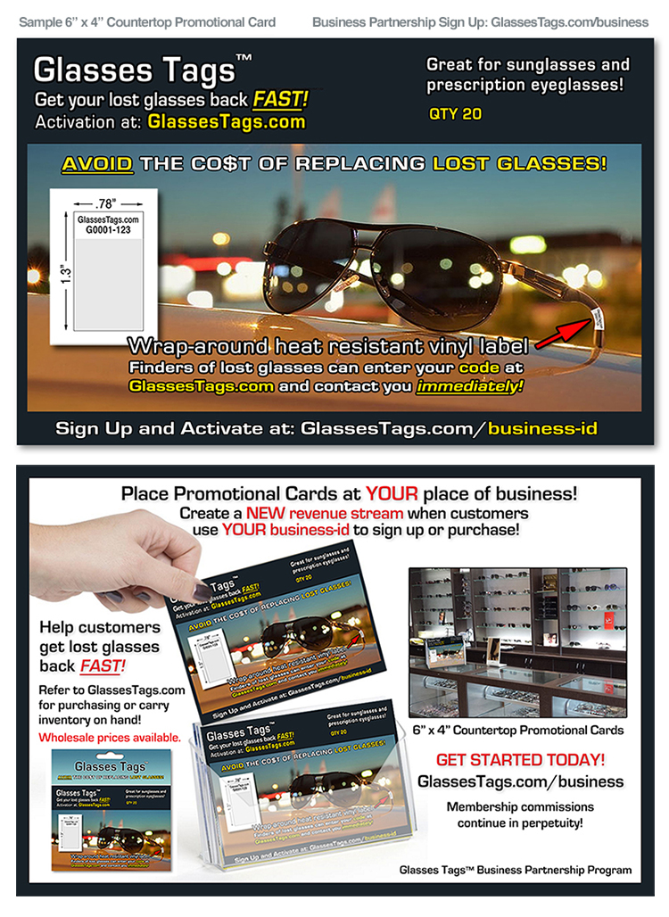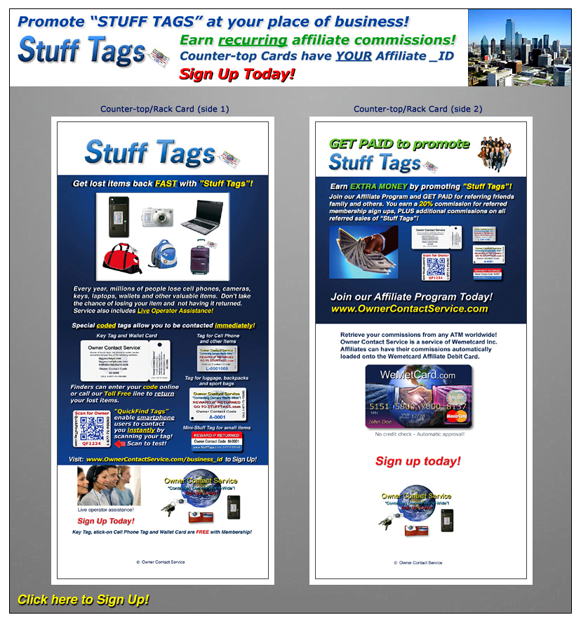 | Lost and Found Services, connects businesses that have lost and found departments, to the "Owner Contact Service" Affiliate Program. Businesses can now earn recurring affiliate commissions by promoting the service to their customers. The Owner Contact Service, uses special Coded tags, to search for the owner of a lost item either online or by calling our Toll Free line for Live Operator Assistance. Using our "Quick Search" system, items can quickly and easily be returned to their rightful owners. Below is the sample full page promotional banner for businesses. Click here to see sample counter-top card for patrons. For further details and to sign up your lost and found department, click here. |