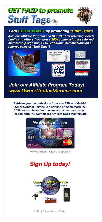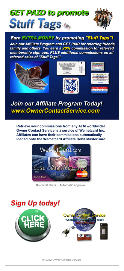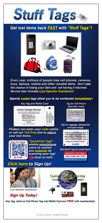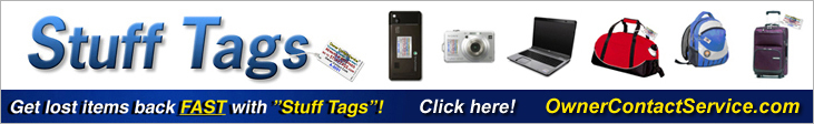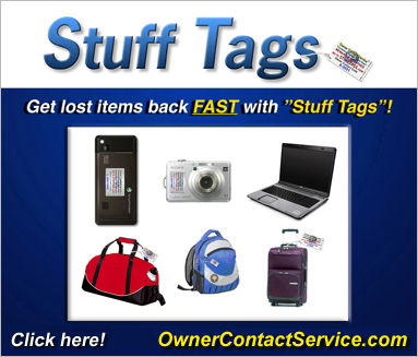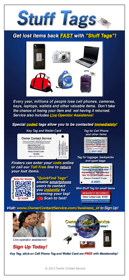 Lost and Found Services, connects businesses that have lost and found departments, to the "Owner Contact Service" Affiliate Program. Businesses can now earn recurring affiliate commissions by promoting the service to their customers. The Owner Contact Service, uses special Coded tags, to search for the owner of a lost item either online or by calling our Toll Free line for Live Operator Assistance. Using our "Quick Search" system, items can quickly and easily be returned to their rightful owners. Below is the sample counter-top/rack card and various banners for promoting the service to local and online patrons. For further details and to sign up your lost and found department, click here |